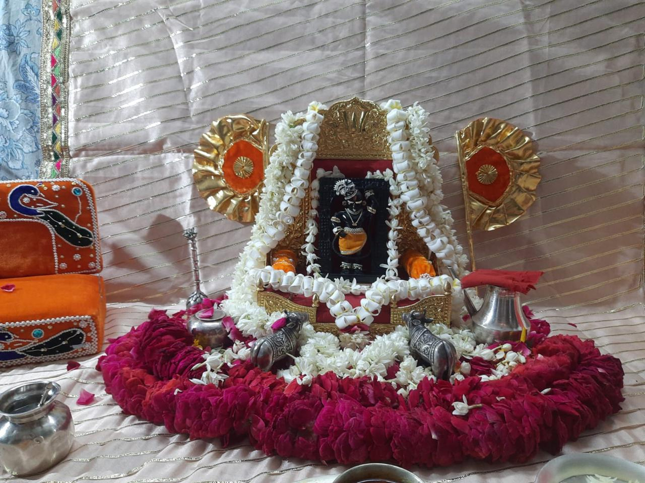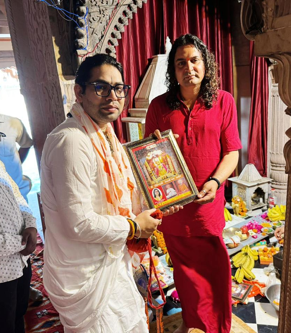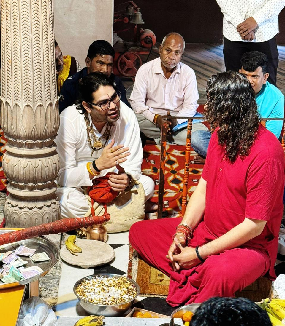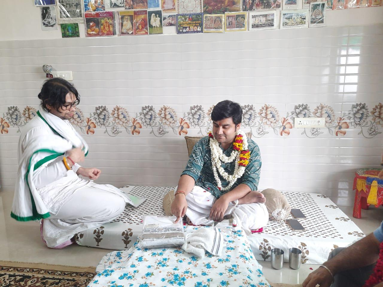 The treasure of Shri Vrindavan, Acharya Indresh Ji Upadhyay, graced Shri Radha Rani Kunj with his divine presence and with him Shri Radha Girdhar Lal also flourished Shri Kunj. A blessed occasion unfolded as the sacred bhog seva darshan of Shri Radha Girdhar Lal Ji was performed at the Kunj, followed by the holy Prasadi Seva of Shri Maharaj Ji — filling every heart with devotion and divine grace